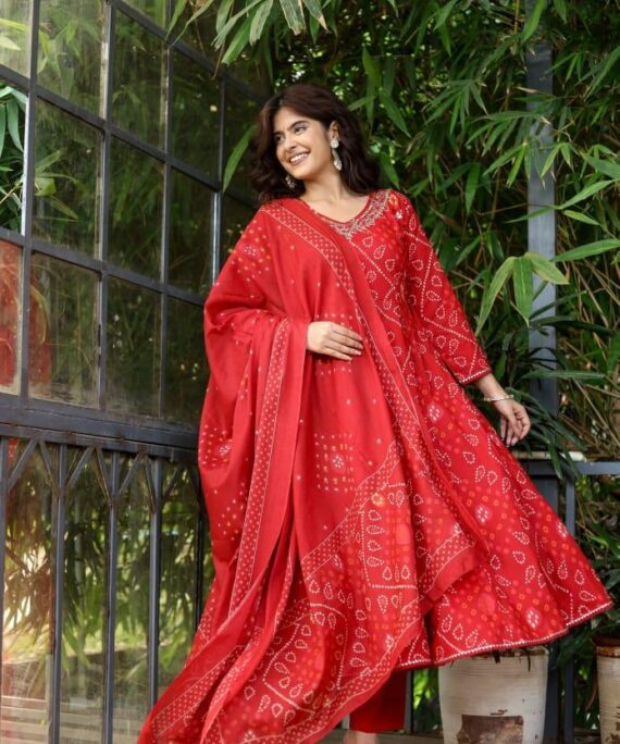 Bandhni Cotton Anarkali Set with Beautiful Neck Work