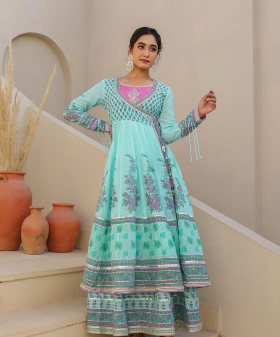 Angrakha Style Full Embroidered Cotton Anarkali Set